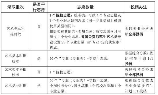 答:藝術(shù)類本科批??紝I(yè)安排3次志愿填報(bào),不實(shí)行平行志愿,實(shí)行以學(xué)校為單位的志愿模式,每次只能填報(bào)1個(gè)高校志愿和1個(gè)專業(yè)志愿。