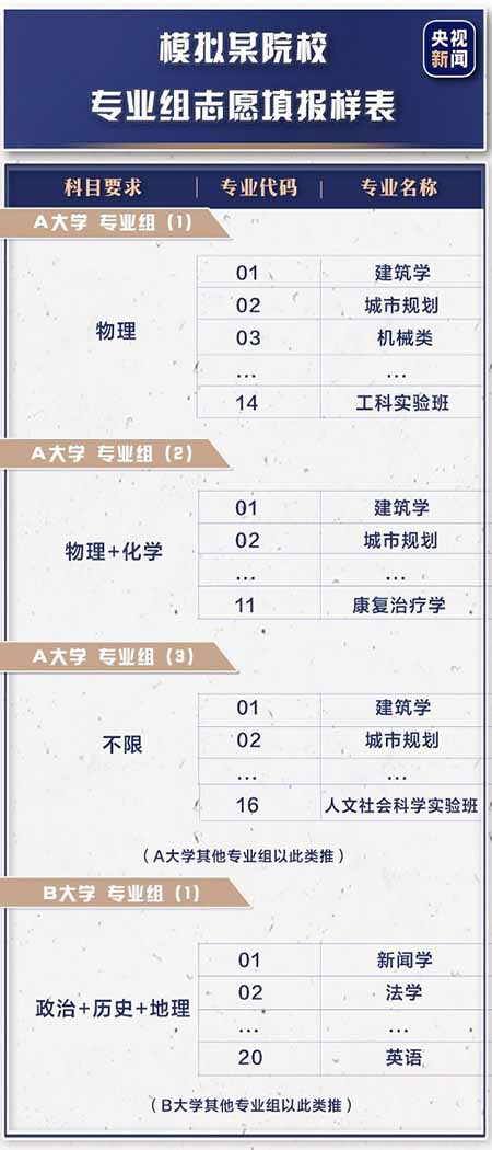 學(xué)生在填報志愿表時,按照“院校專業(yè)組 專業(yè)”的方式填寫,只要選考科目符合要求,學(xué)生就可以在志愿表第1行填寫A大學(xué)專業(yè)組(1) 該專業(yè)組后面的幾個專業(yè),第2行填寫A大學(xué)專業(yè)組(2) 該專業(yè)組后面的幾個專業(yè),以此類推。