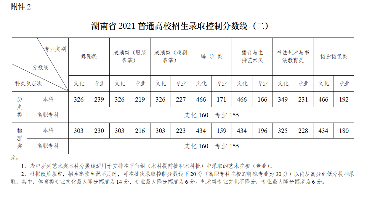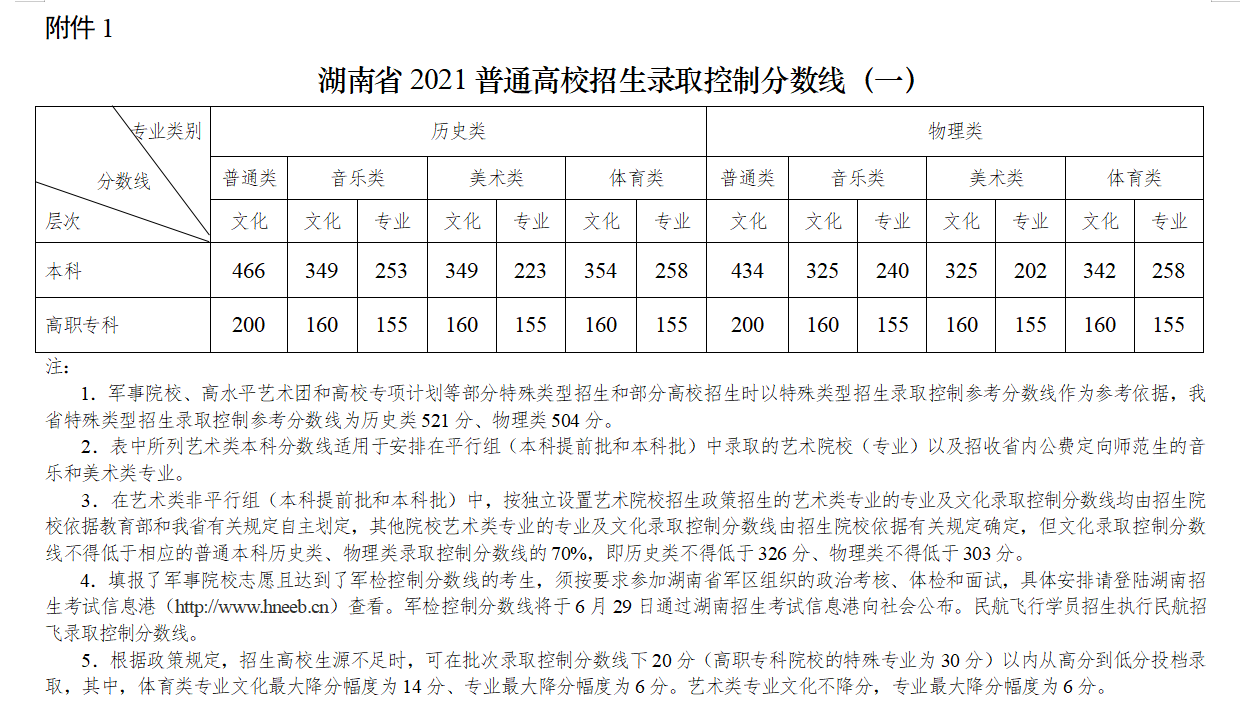 湖南省2021普通高校招生錄取控制分?jǐn)?shù)線