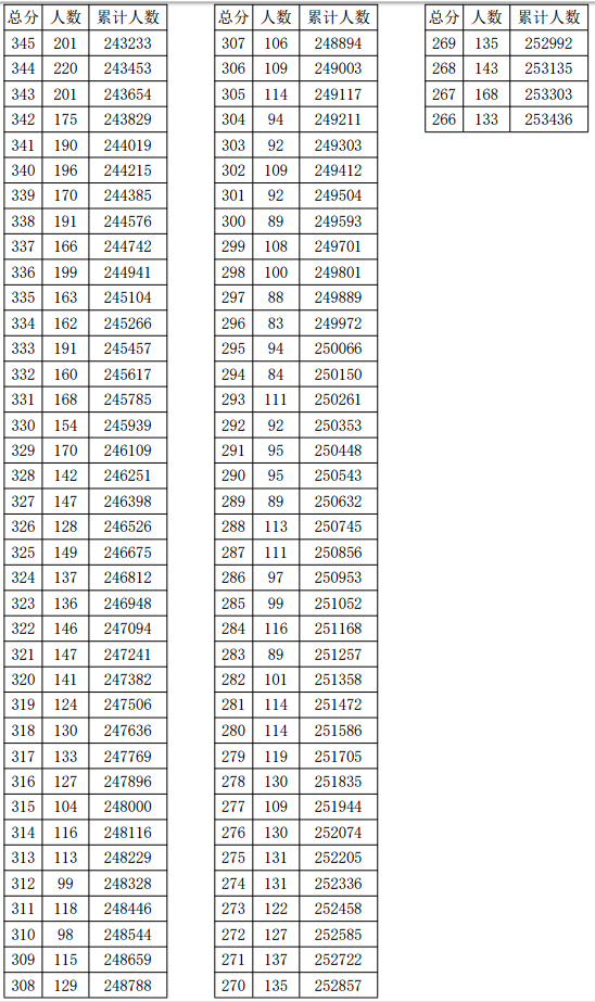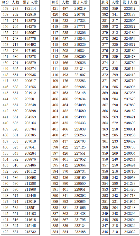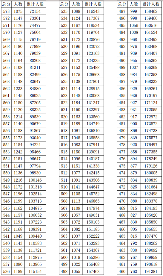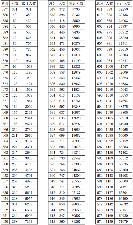 浙江省2021年普通高校招生成績(jī)分?jǐn)?shù)段表(總分)