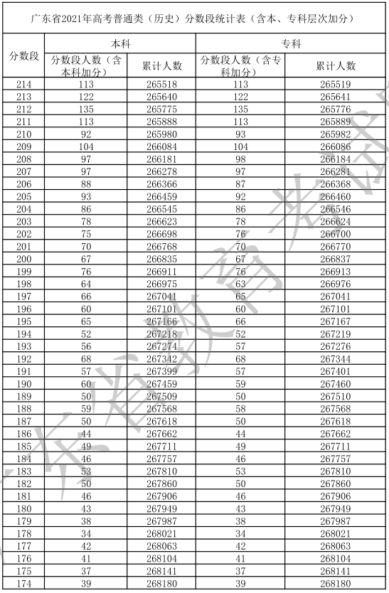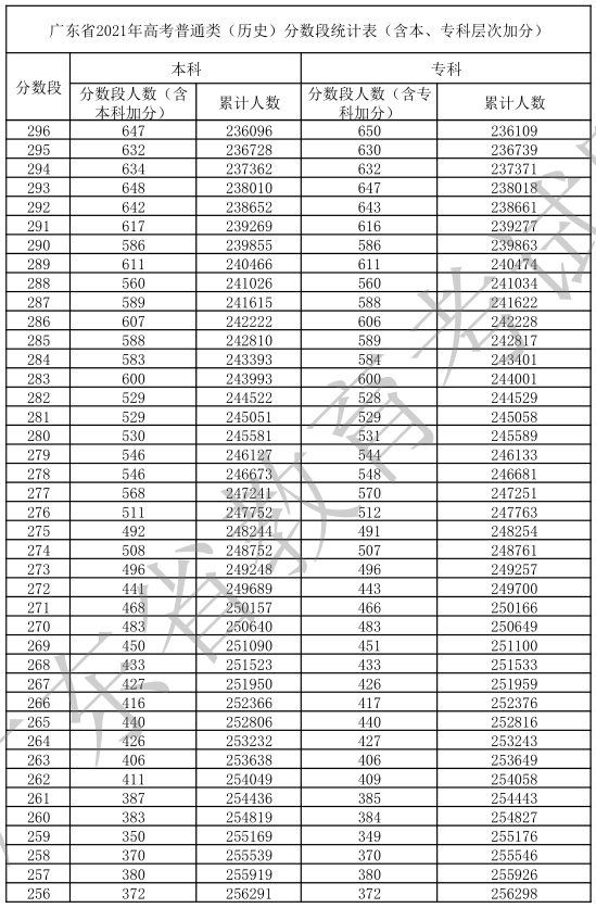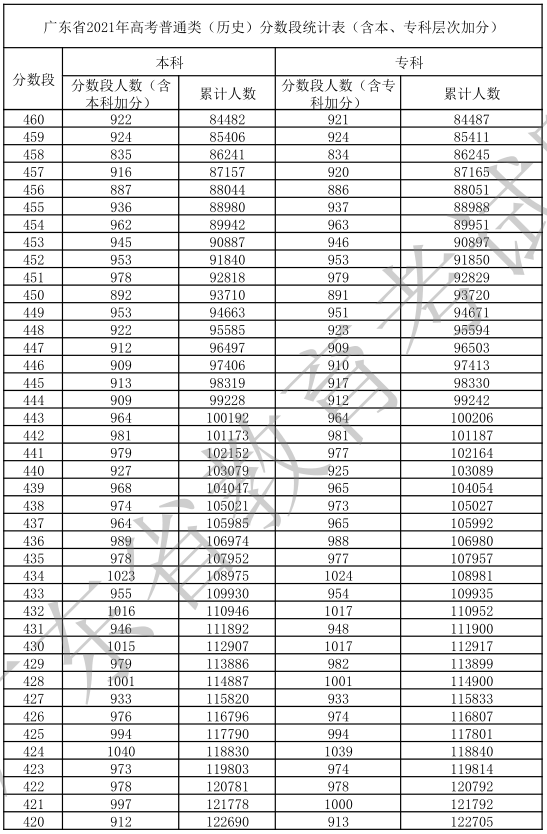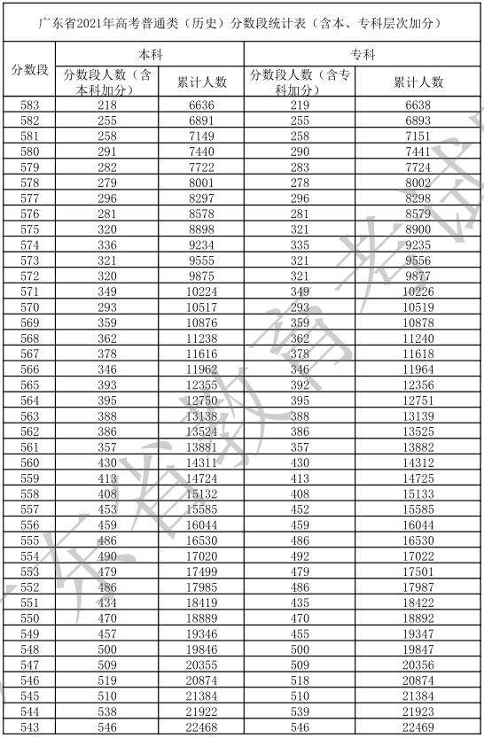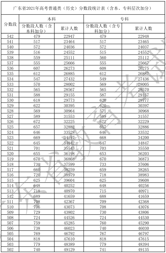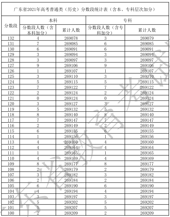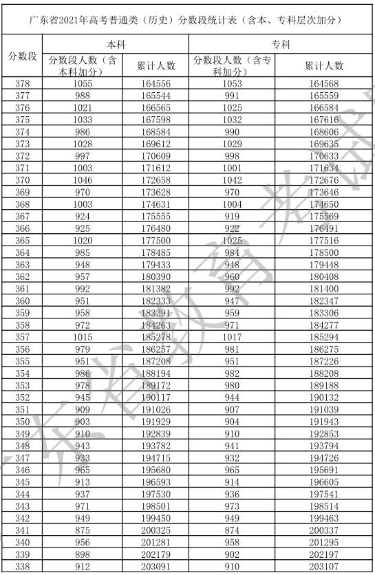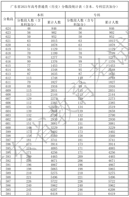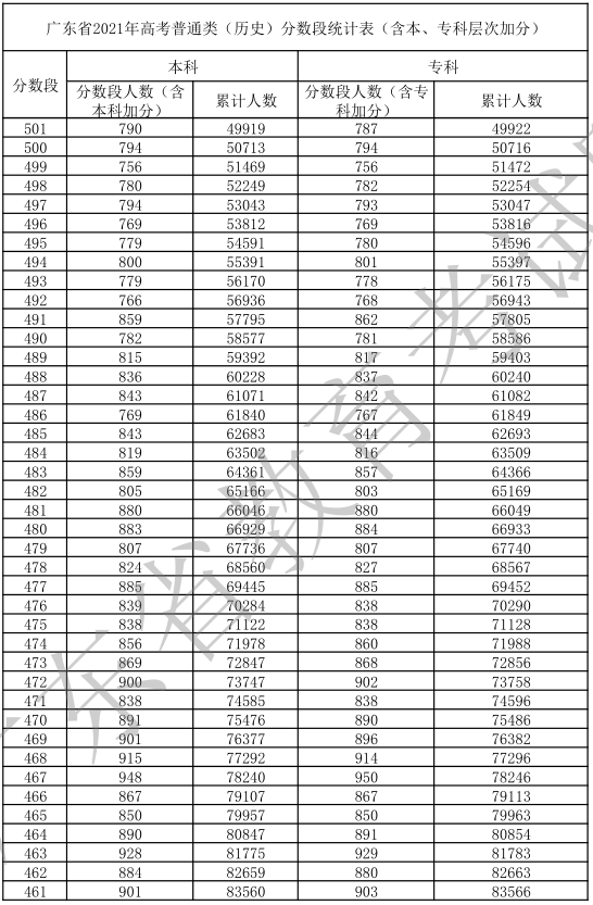 廣東省2021年高考普通類(歷史)分數(shù)段統(tǒng)計表(含本、專科層次加分)