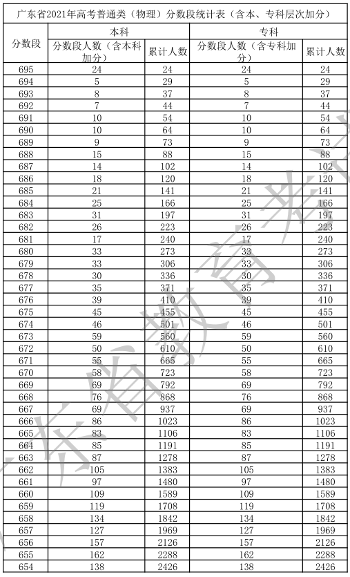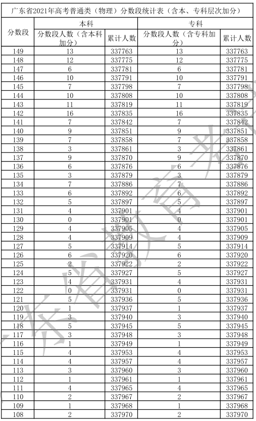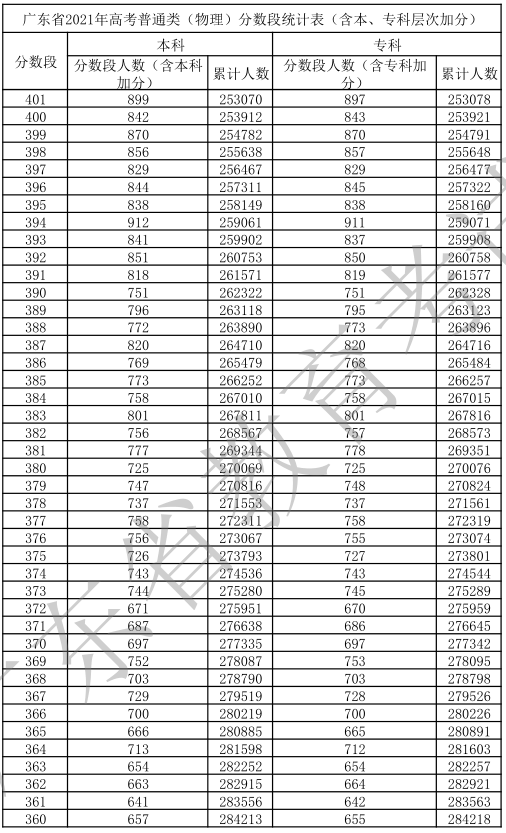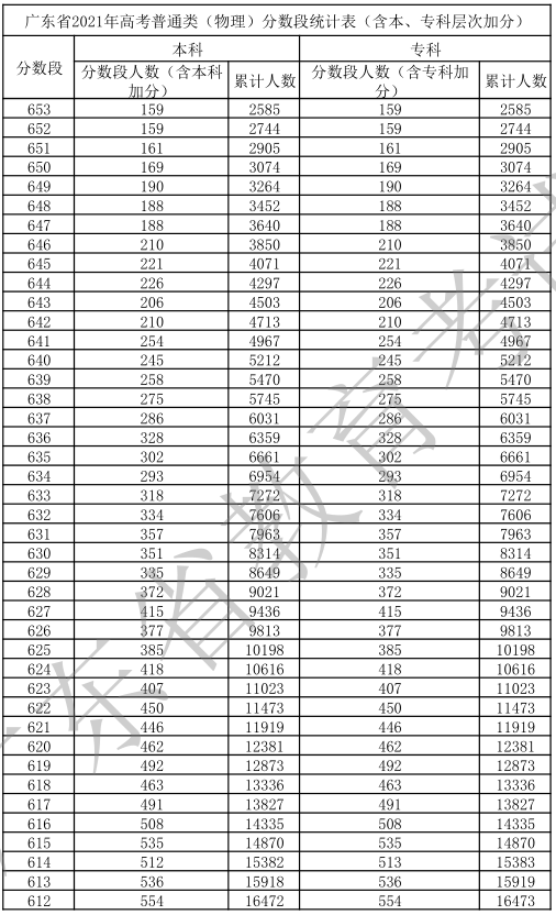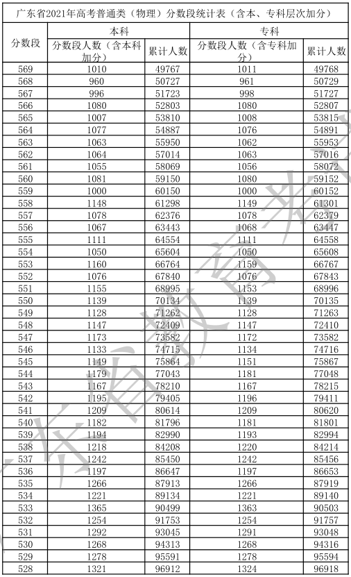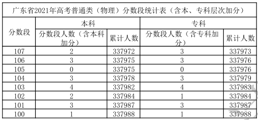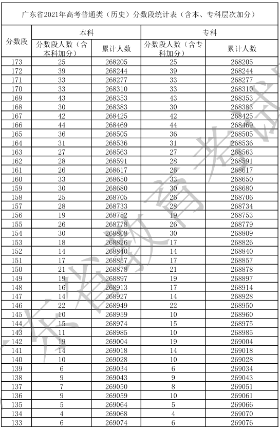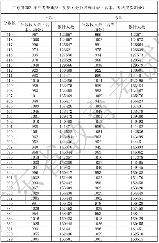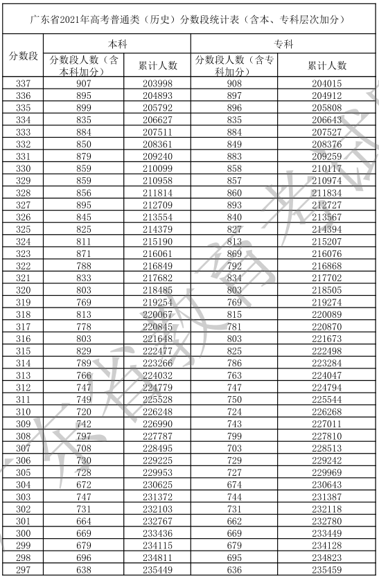 廣東省2021年高考普通類(歷史)分數(shù)段統(tǒng)計表(含本、專科層次加分)