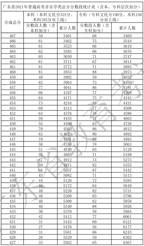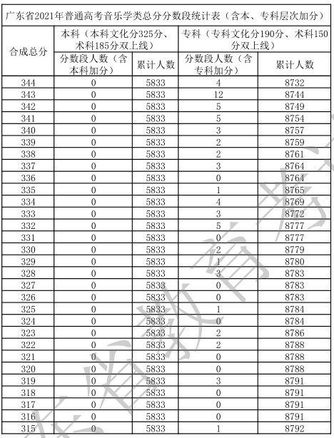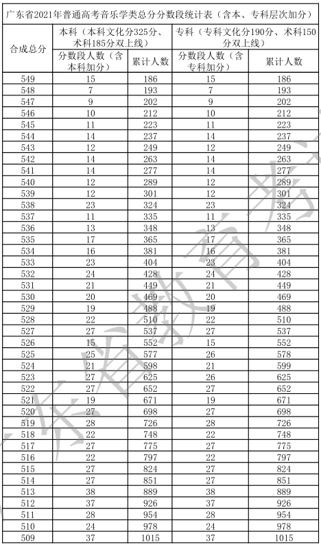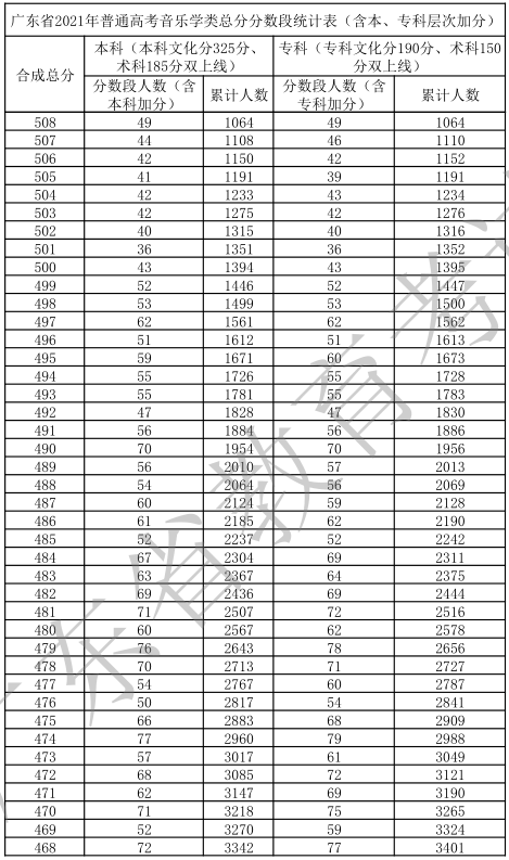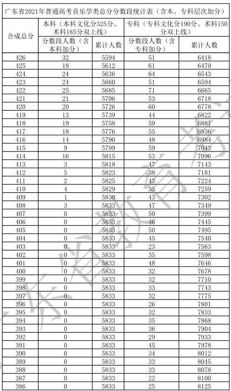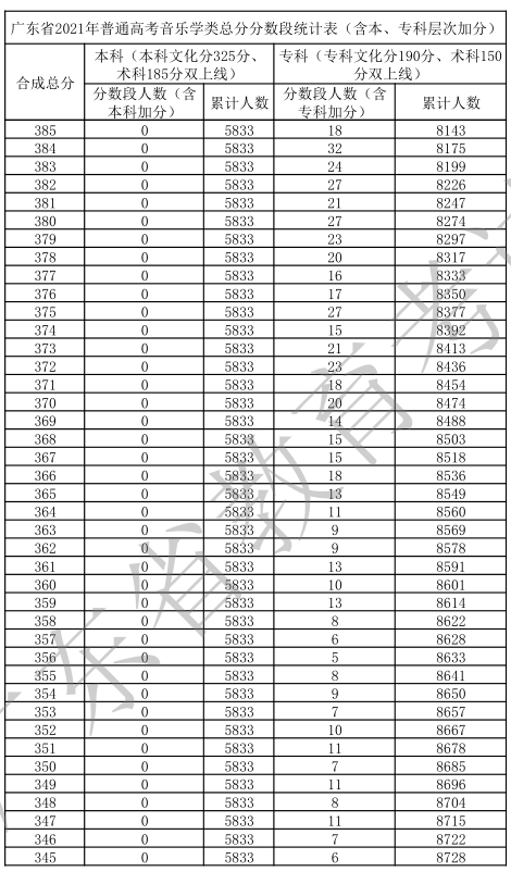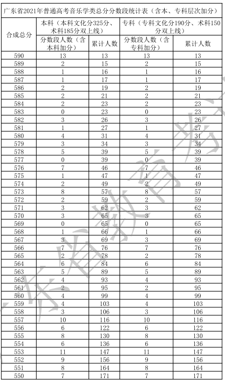 廣東省2021年高考一分一段統(tǒng)計表(音樂學(xué)類)