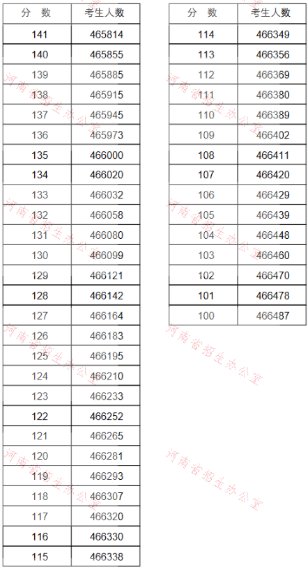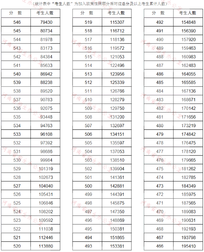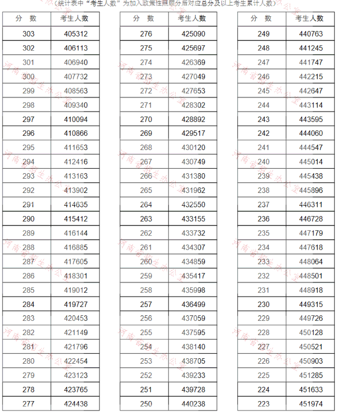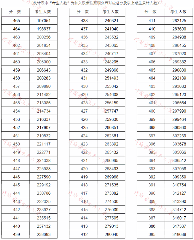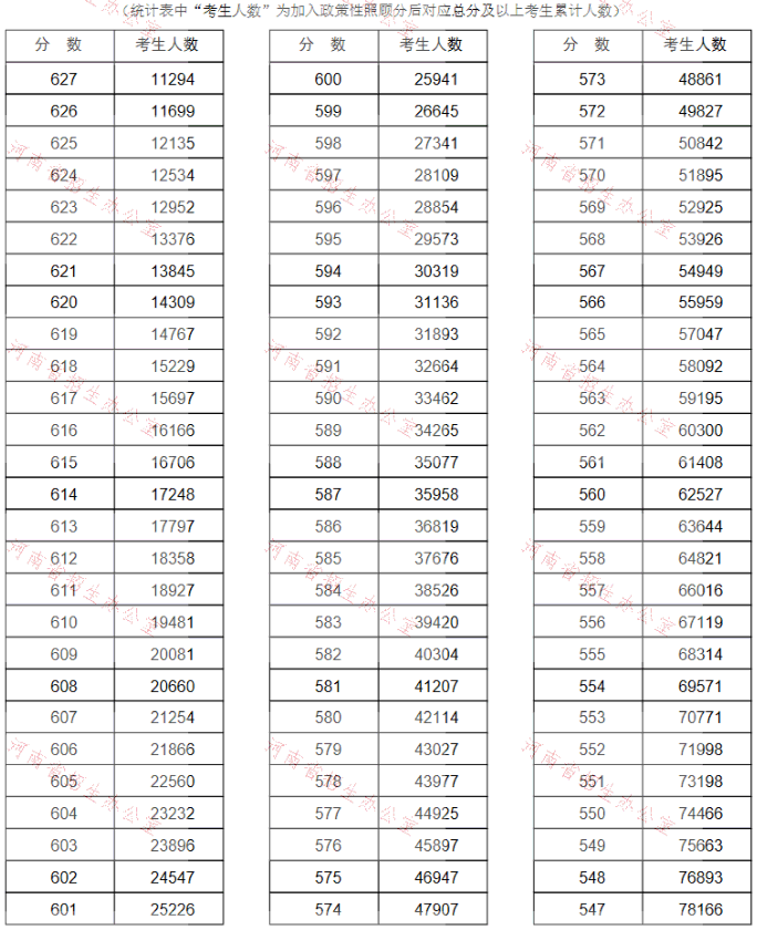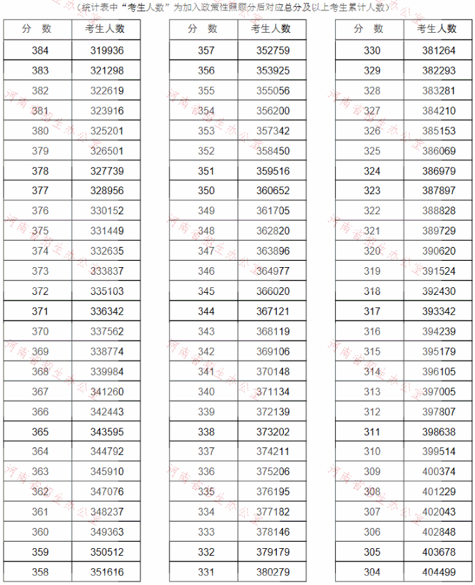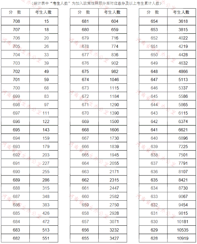 河南省2021年高考(理科)成績一分一段表