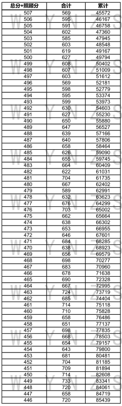 2021年云南省高考理科成績分?jǐn)?shù)段統(tǒng)計表