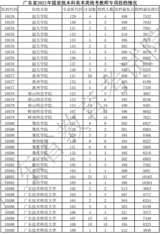 廣東省2021年提前批本科美術類統(tǒng)考教師專項投檔情況