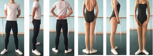 1.服裝要求:健美操女生,上身純黑色吊帶芭蕾形體服,肉色褲襪;健美操男生,純白色緊身短袖,純黑色緊身褲。如下圖,服裝上不得有標(biāo)志身份信息的特殊 logo 或圖案。