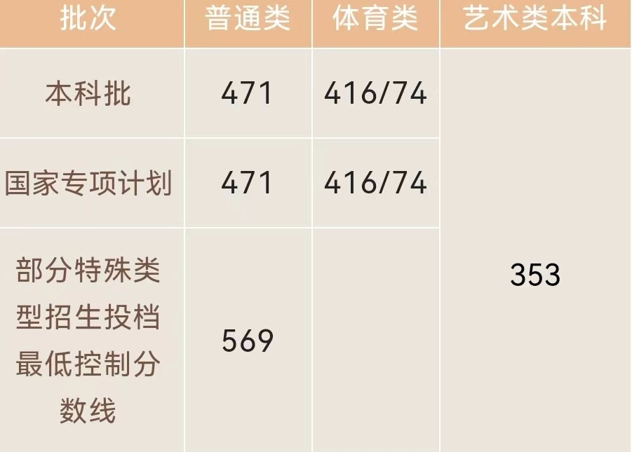 本科批普通類分?jǐn)?shù)線為483分;國家專項計劃普通類分?jǐn)?shù)線為483分;本科體育類文化成績分?jǐn)?shù)線為415分、專業(yè)成績分?jǐn)?shù)線為74分;本科藝術(shù)類【舞蹈學(xué)類、音樂表演類(聲樂)、音樂表演類(器樂)、服裝表演類、...