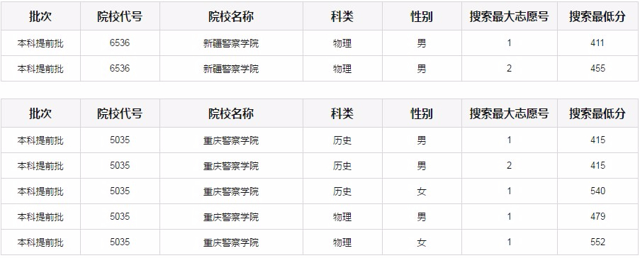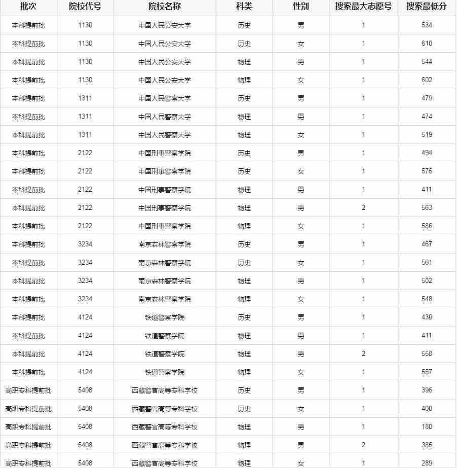 專(zhuān)科層次:對(duì)符合相關(guān)條件且填報(bào)有公安院校志愿的重慶戶(hù)籍考生,按照志愿優(yōu)先的原則,在我市普通類(lèi)專(zhuān)科控制線上、本科控制線以下,區(qū)分院校、性別、首選科目,從高分到低分,按照不低于招生計(jì)劃數(shù)與考生人數(shù)1:3確定。先搜索一志愿,再搜索二志愿,搜索最大志愿號(hào)為“1”表示一志愿生源已足,不再搜索二志愿考生,其搜索最低分為一志愿入圍考生最低分;搜索最大志愿號(hào)為“2”表示一志愿專(zhuān)科控制線上考生已全部入圍,其搜索最低分為二志愿入圍考生最低分。對(duì)于文化成績(jī)(含政策性加分)達(dá)到我市本科控制線的考生,不計(jì)比例計(jì)入。