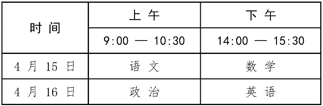 文化考試科目為語文、數(shù)學(xué)、政治、英語四科,每科150分,總分600分。各科目考試時(shí)間如下: