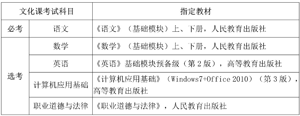 文化課考試設(shè)1門必考科目和2門選考科目。選考科目具體由招生院校根據(jù)專業(yè)培養(yǎng)需要,確定2門選考科目??荚噧?nèi)容為我省中職學(xué)校所開設(shè)以上課程的基本知識,各科指定教材詳見下表: