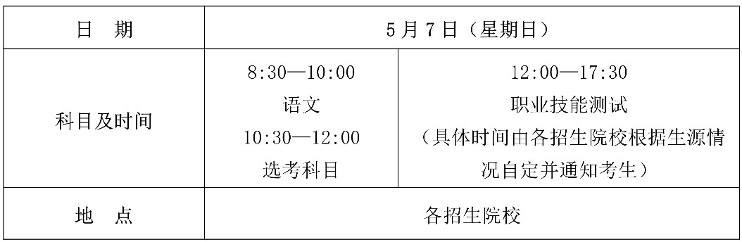 2023年5月15日前,各招生院校須將考生的職業(yè)技能測試成績上傳至報(bào)名系統(tǒng),5月26日前由省考試局統(tǒng)一向考生公布成績。