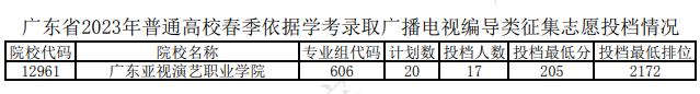 廣東省2023年普通高校春季依據(jù)學(xué)考錄取廣播電視編導(dǎo)類征集志愿投檔情況