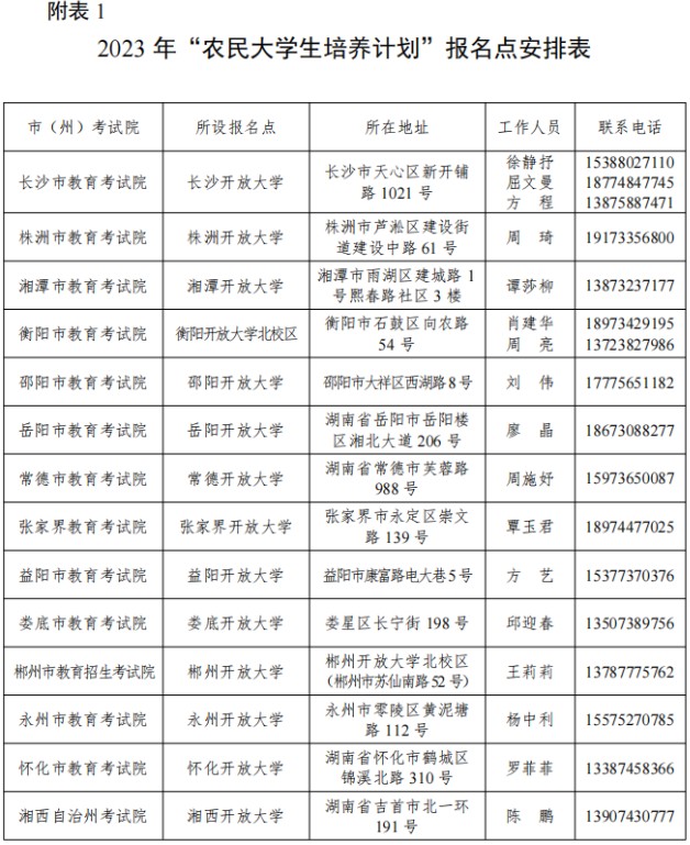每個市(州)只設(shè)一個報名點,考生在戶籍所在市(州)的指定報名點進行高考報名,各市(州)報名點安排詳見《2023年“農(nóng)民大學(xué)生培養(yǎng)計劃”報名點安排表》(詳見附表1)。