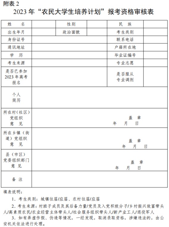 2.2023年 “農(nóng)民大學(xué)生培養(yǎng)計劃”報考資格審核表(點擊下載)