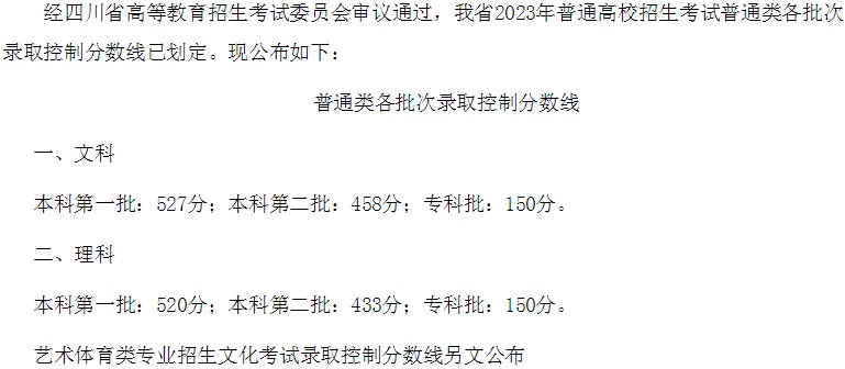 四川省2023年高考普通類各批次錄取控制分?jǐn)?shù)線