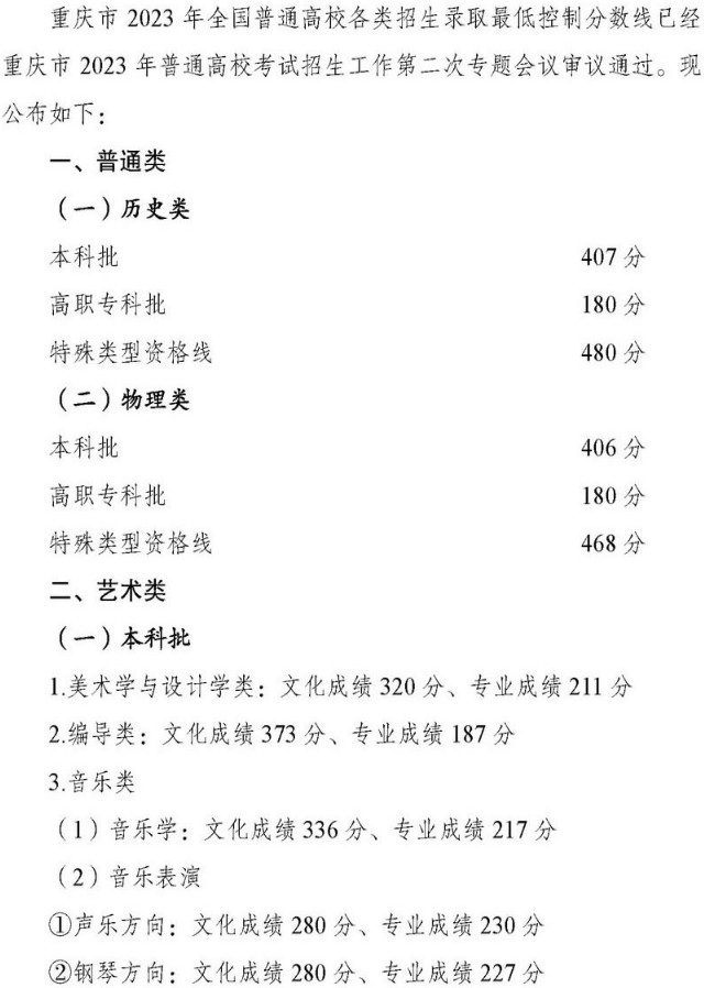 重慶市2023年全國普通高校各類招生錄取最低控制分?jǐn)?shù)線