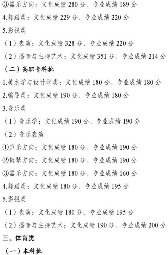 藝術(shù)類 (一)本科批 1. 美術(shù)學(xué)與設(shè)計學(xué)類 :文化成績 333 分 、專業(yè)成績 210 分 2. 編導(dǎo)類:文化成績 426 分 、專業(yè)成績 209 分
