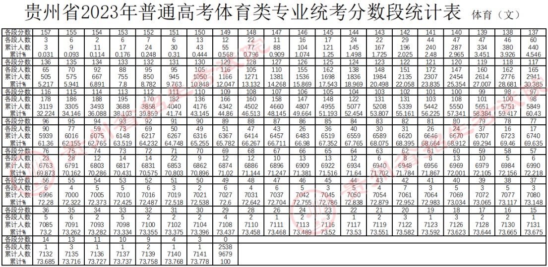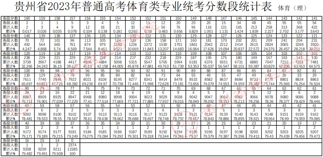 2023年貴州省普通高考體育類專業(yè)統(tǒng)考合格線、考生成績、分?jǐn)?shù)段統(tǒng)計(jì)表