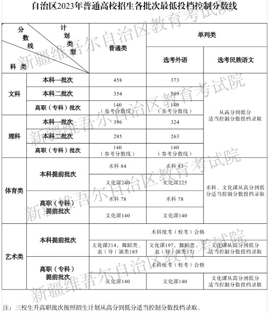 新疆2023年普通高校招生各批次最低投檔控制分?jǐn)?shù)線