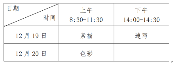 美術(shù)與設(shè)計(jì)類專業(yè)省統(tǒng)考安排在 2020年12月19日-20日進(jìn)行,各科目考試時(shí)間具體安排如下: