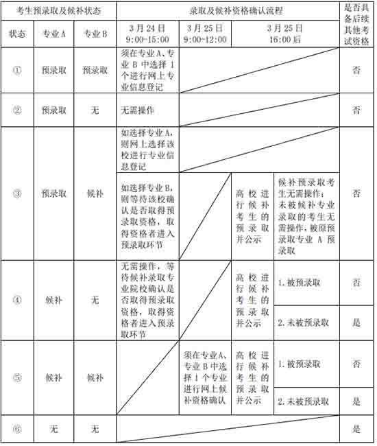5. 取得兩個專業(yè)候補錄取資格的考生,須在3月25日9:00-12:00,在網(wǎng)上選擇其中一個專業(yè)進行候補資格確認,如院校確認其最終取得預(yù)錄取資格,無需操作,默認被預(yù)錄?。ㄗ⒁猓捍_認候補資格的考生不一定會被錄取,要根據(jù)該校預(yù)錄取考生的錄取確認情況而定)。