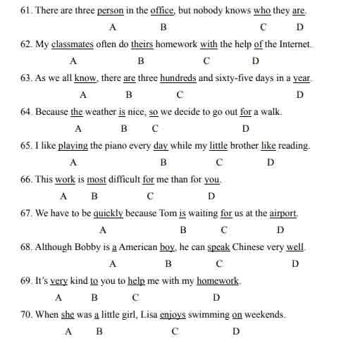 下面各句ABCD四個(gè)選項(xiàng)中有一處是錯(cuò)誤的,請(qǐng)找出,并將答題卡對(duì)應(yīng)位置上的標(biāo)號(hào)涂黑。