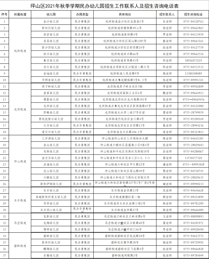 2021年坪山秋季民辦幼兒園招生工作開始啦!