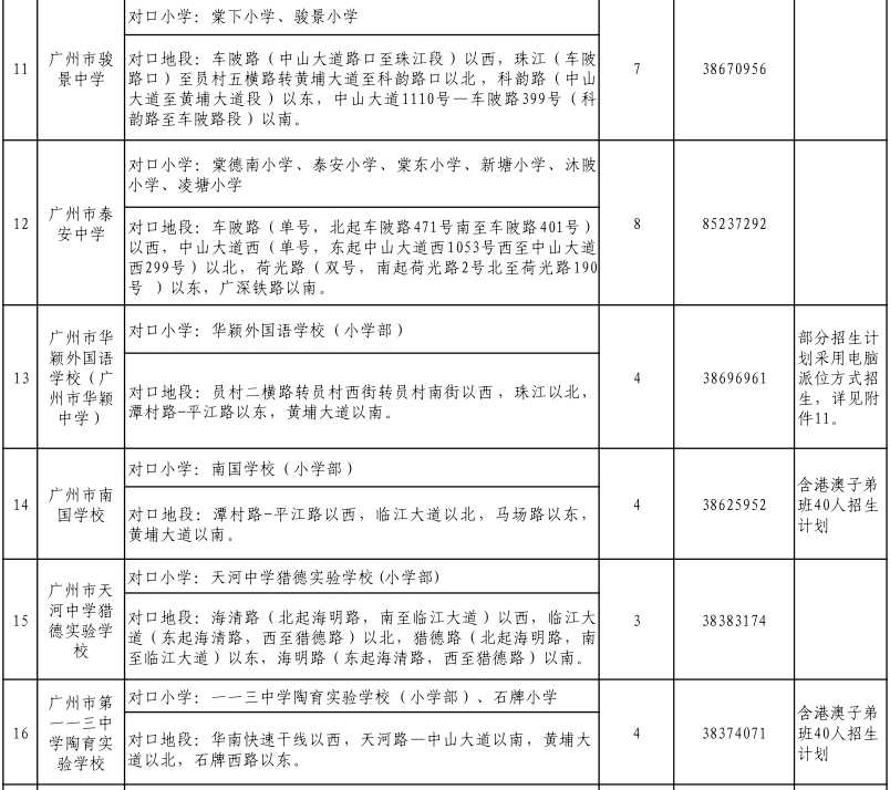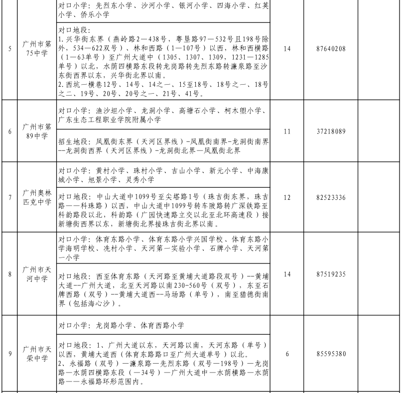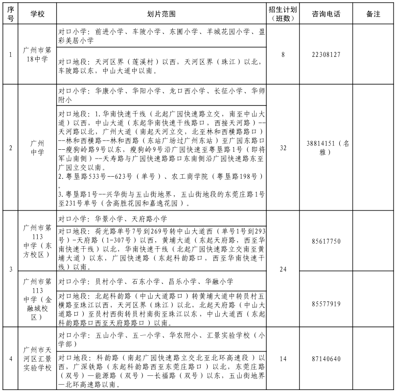 2021年天河區(qū)公辦初中劃片范圍及招生計劃表