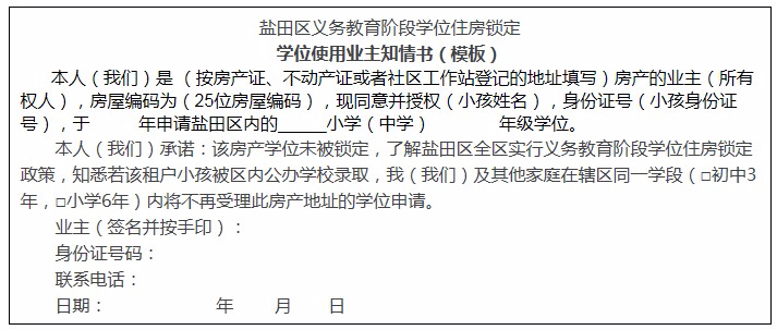 ④非自有產(chǎn)權(quán)房的須提供由業(yè)主簽字并按手印同意的《學(xué)位使用業(yè)主知情書(shū)》。非自有產(chǎn)權(quán)房的鹽田戶籍申請(qǐng)人且在鹽田區(qū)實(shí)際居住的,其所租住的房屋因已被鎖定或無(wú)法鎖定而無(wú)法提供《學(xué)位使用業(yè)主知情書(shū)》的,需簽署《學(xué)位申請(qǐng)服從調(diào)劑承諾書(shū)》,由區(qū)教育局在全區(qū)范圍內(nèi)統(tǒng)籌派發(fā)學(xué)位?!秾W(xué)位使用業(yè)主知情書(shū)》模板如下。