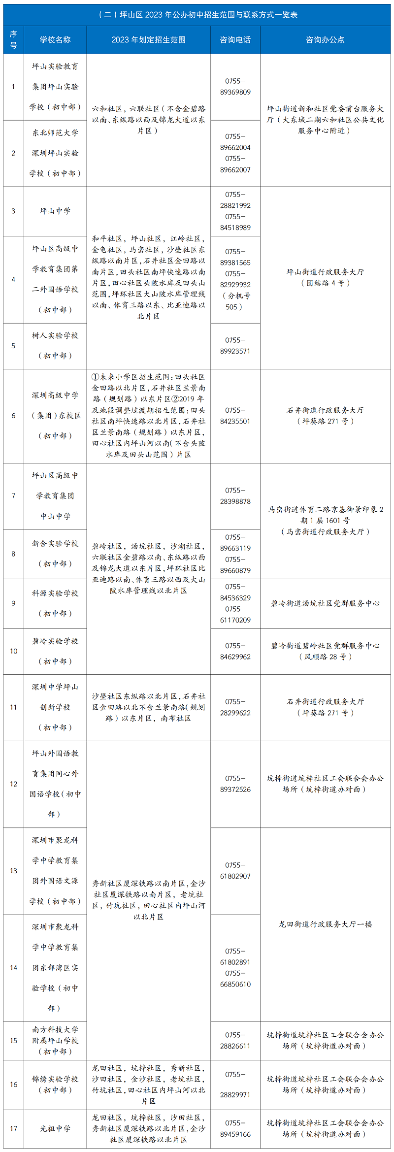 坪山區(qū)2023年公辦初中招生范圍與聯(lián)系方式一覽表