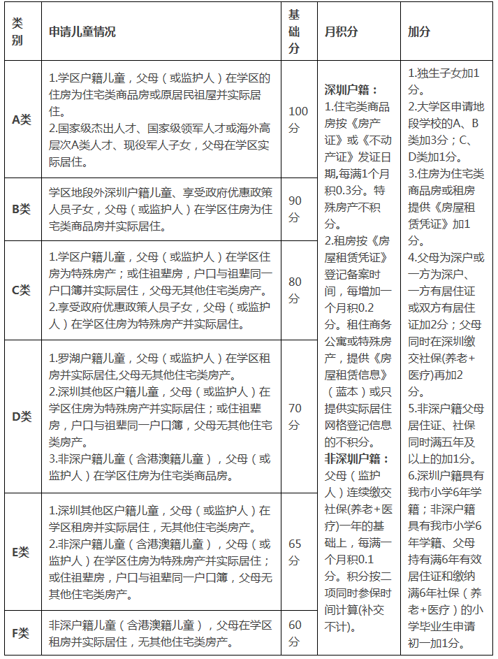 (3)加分。①獨生子女加1分。②實行大學(xué)區(qū)招生的地段,申請原地段學(xué)校的A、B類加3分;C、D類加1分。③住房為住宅類商品房或租房提供《房屋租賃憑證》加1分。④父母為深戶或一方為深戶、一方有居住證或雙方有居住證加2分;父母同時在深圳繳交社保(養(yǎng)老 醫(yī)療)再加2 分。⑤非深戶籍父母居住證、社保同時滿五年及以上的加1分。⑥深圳戶籍具有我市小學(xué)6年學(xué)籍,非深戶籍具有我市小學(xué)6年學(xué)籍、父母持有滿6年有效居住證和繳納滿6年社保(養(yǎng)老 醫(yī)療)的小學(xué)畢業(yè)生申請初一加1分。