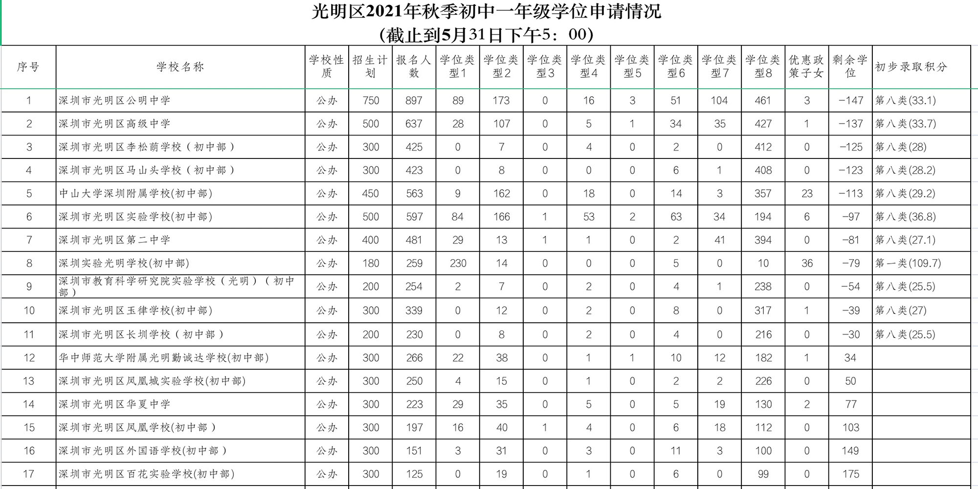 2021年光明區(qū)秋季初一(公辦+民辦)學(xué)位申請情況