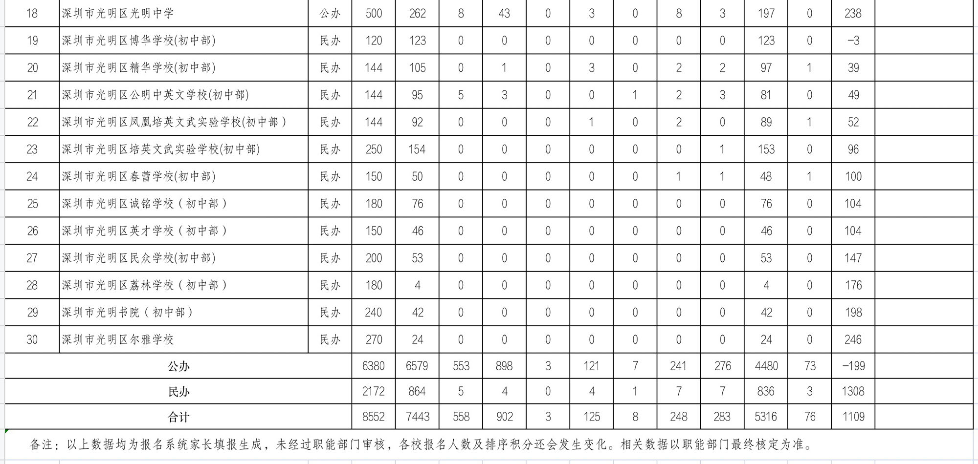 光明區(qū)教育局提醒,目前數(shù)據(jù)均為報(bào)名系統(tǒng)家長填報(bào)生成,未經(jīng)過職能部門審核,各校報(bào)名人數(shù)及排序積分還會(huì)發(fā)生變化。相關(guān)數(shù)據(jù)以職能部門最終核定為準(zhǔn)。