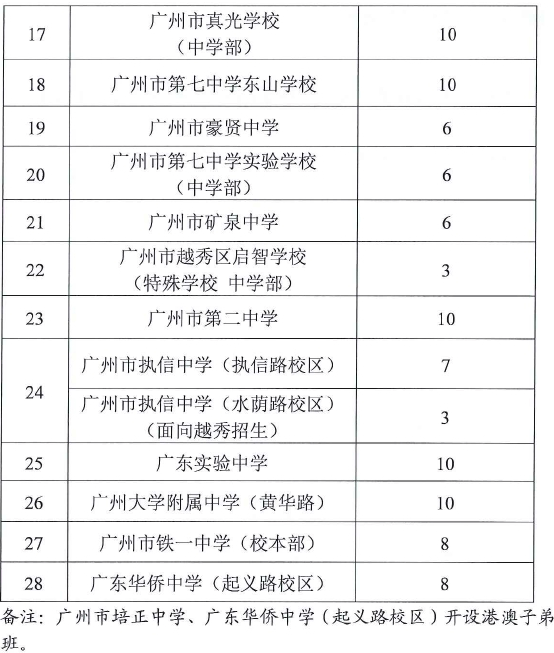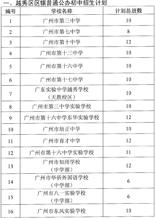 2021年越秀區(qū)公辦初中學校招生計劃