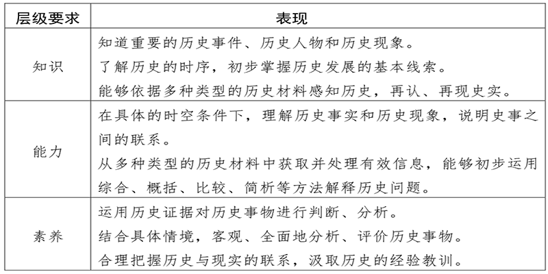 依據(jù)《義務(wù)教育歷史課程標(biāo)準(zhǔn)(2011版)》和義務(wù)教育階段統(tǒng)編歷史教材編寫(xiě)理念及內(nèi)容,確定初中學(xué)業(yè)水平考試分為三個(gè)等級(jí)考查,高層級(jí)兼容低層級(jí)的要求。各層級(jí)表現(xiàn)如下:
