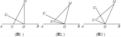 (3)若將圖1中的三角尺繞點O以每秒5°的速度沿順時針方向旋轉(zhuǎn)的同時,射線OC也繞點O以每秒8°的速度沿順時針方向旋轉(zhuǎn),如圖3,那么經(jīng)過多長時間,射線OC第一次平分∠MON?請說明理由.
