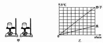 16.小強是一個喜歡思考的同學,他隨家人到海邊玩耍時,發(fā)現(xiàn)陽光下的海水和岸邊的沙子溫差很大。于是,他帶回一些岸邊的沙子想比較沙子和水這兩種物質(zhì)吸熱能力的差異。他設(shè)計如圖甲所示的實驗裝置,所使用儀器規(guī)格也完全相同。請你來幫他完成實驗: