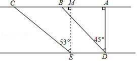 20.(8分)如圖所示,某施工隊(duì)要測(cè)量隧道長(zhǎng)度BC,AD=600米,AD⊥BC,施工隊(duì)站在點(diǎn)D處看向B,測(cè)得仰角為45°,再由D走到E處測(cè)量,DE∥AC,ED=500米,測(cè)得仰角為53°,求隧道BC長(zhǎng).(sin53°≈
