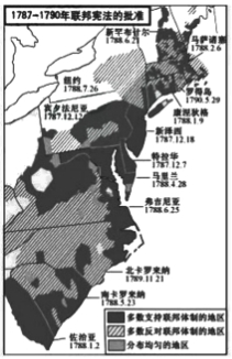 16.1787年,美國制憲會議經(jīng)過長達(dá)四個月的激烈辯論,通過了聯(lián)邦憲法,各州批準(zhǔn)憲法情況見右圖。據(jù)此可知,當(dāng)時的美國