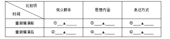 (1)據(jù)材料,分析《十五貫》重新編演前后的變化,完成下列表格(將答案填寫在答題卡相應(yīng)位置)。(6分)