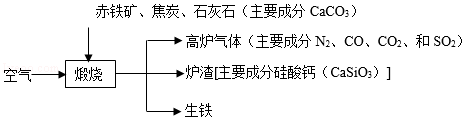 (1)生鐵屬于材料(填“合成”或“金屬”)?!案郀t氣體”中的(填化學(xué)式)會導(dǎo)致酸雨。