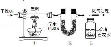 連接裝置,檢查氣密性,裝入試 劑并按如圖進(jìn)行實(shí)驗(yàn)。通入O2, 一段時(shí)間后,點(diǎn)燃J處酒精燈。 | 裝置K中無水CuSO4變 ①色 | 塑料燃燒產(chǎn)物中有H2O |