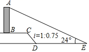 7.如圖,AB是一垂直于水平面的建筑物,某同學(xué)從建筑物底端B出發(fā),先沿水平方向向右行走20米到達(dá)點(diǎn)C,再經(jīng)過一段坡度(或坡比)為i=1:0.75、坡長(zhǎng)為10米的斜坡CD到達(dá)點(diǎn)D,然后再沿水平方向向右行走40米到達(dá)點(diǎn)E(A,B,C,D,E均在同一平面內(nèi)).在E處測(cè)得建筑物頂端A的仰角為24°,則建筑物AB的高度約為(參考數(shù)據(jù):sin24°≈0.41,cos24°≈0.91,tan24°=0.45)( ?。?/span>