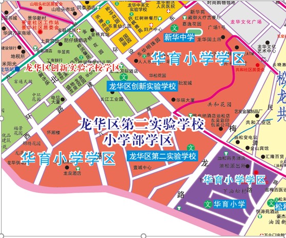 學區(qū)范圍二:建設(shè)西路以東、僑龍路以西、鴻尚路以南、建設(shè)東路以東、東環(huán)二路以南、龍華大道以西、工業(yè)路以北范圍(居住在龍華區(qū)第二實驗學校小學部學區(qū)范圍內(nèi)的適齡兒童可以選擇申請華育小學學位)。