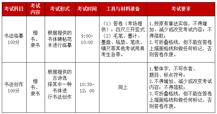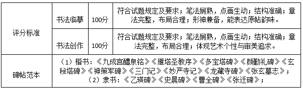 書法術(shù)科總分 100 分(書法:臨摹卷面分的50% 創(chuàng)作卷面分的50%)。書法臨摹、書法創(chuàng)作的卷面滿分均為100分。