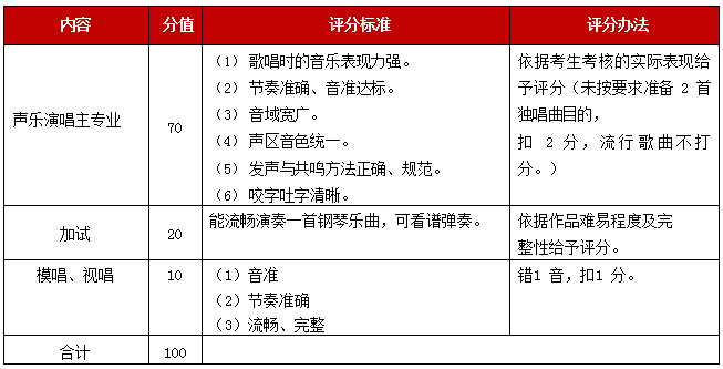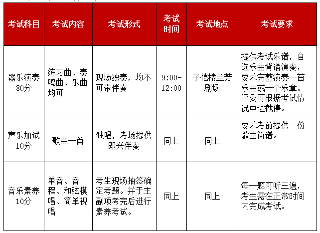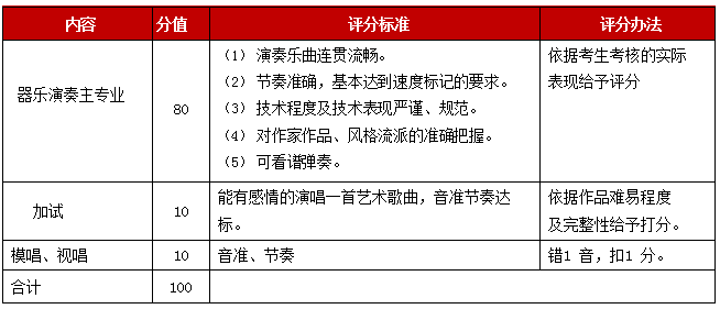【注:器樂考生演奏時(shí)間不超過三分鐘,且評(píng)委有權(quán)中間叫停,并指定演奏該曲某一樂段;考生當(dāng)天須上交一份本次考試曲譜給工作人員;考場提供鋼琴、架子鼓,其他樂器自備?!?/p>