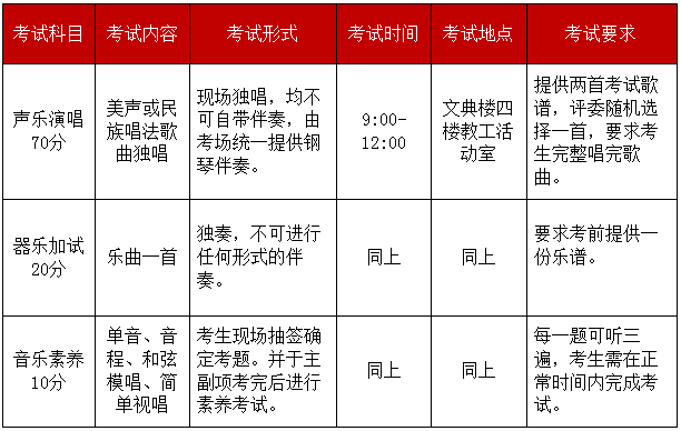 【注:準(zhǔn)備2首歌曲,自備伴奏樂譜。由考官現(xiàn)場抽取一首歌曲進(jìn)行考試。考生自備紙質(zhì)伴奏譜(簡譜或五線譜),用信封密封好,于現(xiàn)場報(bào)名時(shí)交至音樂辦公室,并簽字確認(rèn)?!?/p>