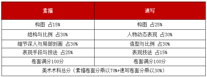 美術(shù)術(shù)科總分 100 分(繪畫:素描卷面分的70% 速寫卷面分的30%)。素描、速寫的卷面滿分均為100分。