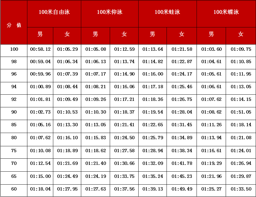 (二)泳姿:自由泳、蛙泳、蝶泳、仰泳四種泳姿中選取一種泳姿考試,距離:100米,在標(biāo)準(zhǔn)的50米游泳池考核。